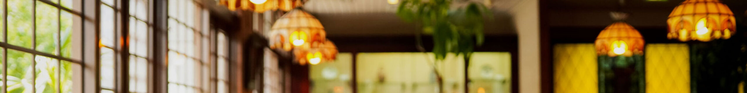 大きな格子窓に囲まれた開放的な空間は、赤い絨毯とダークブラウンの家具、アンティーク調のランプが調和した、レトロで上品な雰囲気があります。